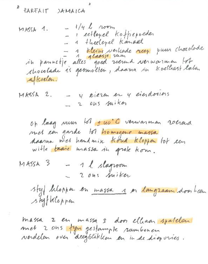 Ik vertel dit verhaal vaak als ik ergens moet spreken, omdat het zo veel zegt over hoe ontwerpen werkt. Mijn vader was kok. Ik ben opgegroeid tussen de potten en pannen in het restaurant van mijn ouders. Mijn vader maakte een 'Parfait Jamaica' om je vingers bij af te likken. Ik vroeg hem eens het recept. Dat had hij niet, maar na wat doorzeuren krabbelde hij iets op papier: