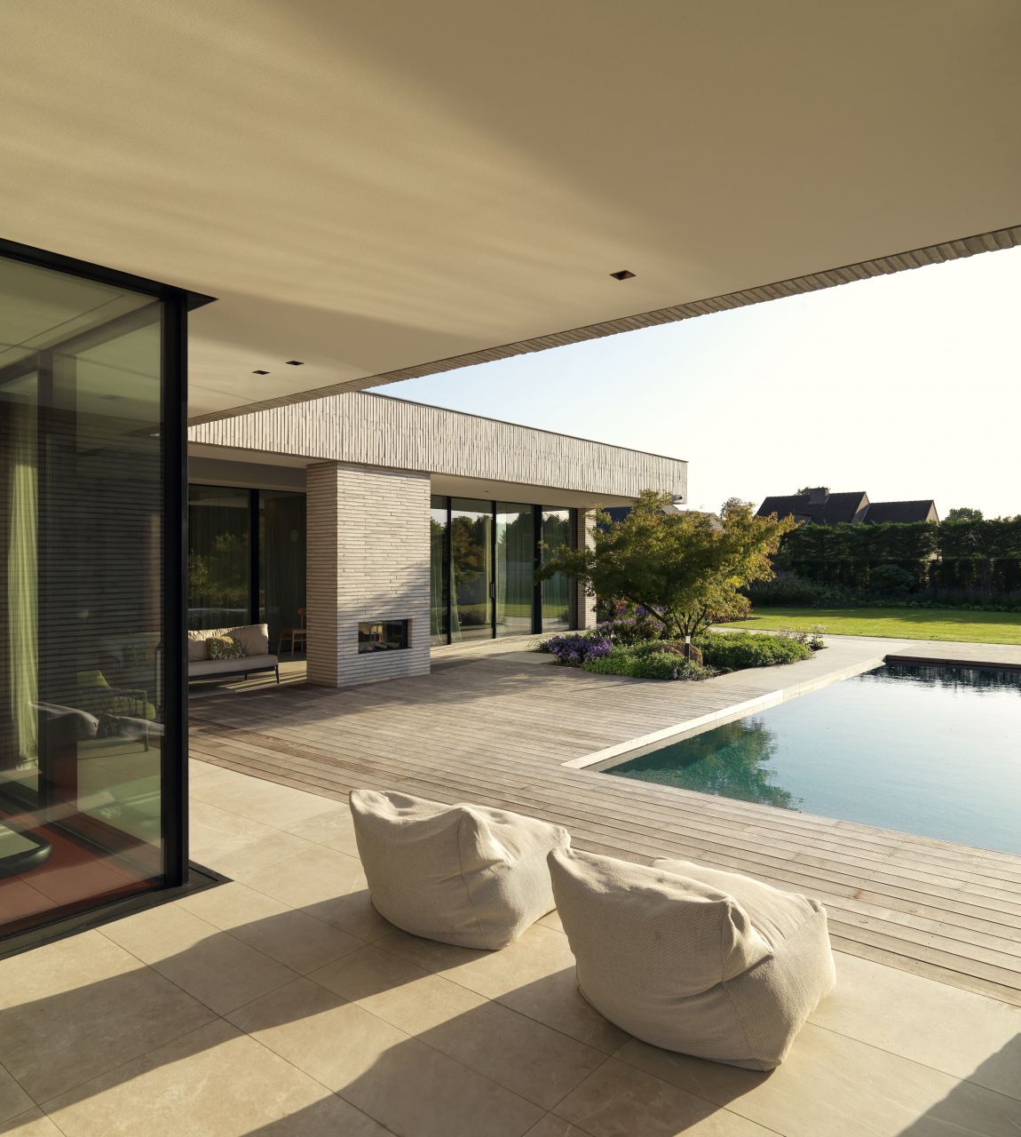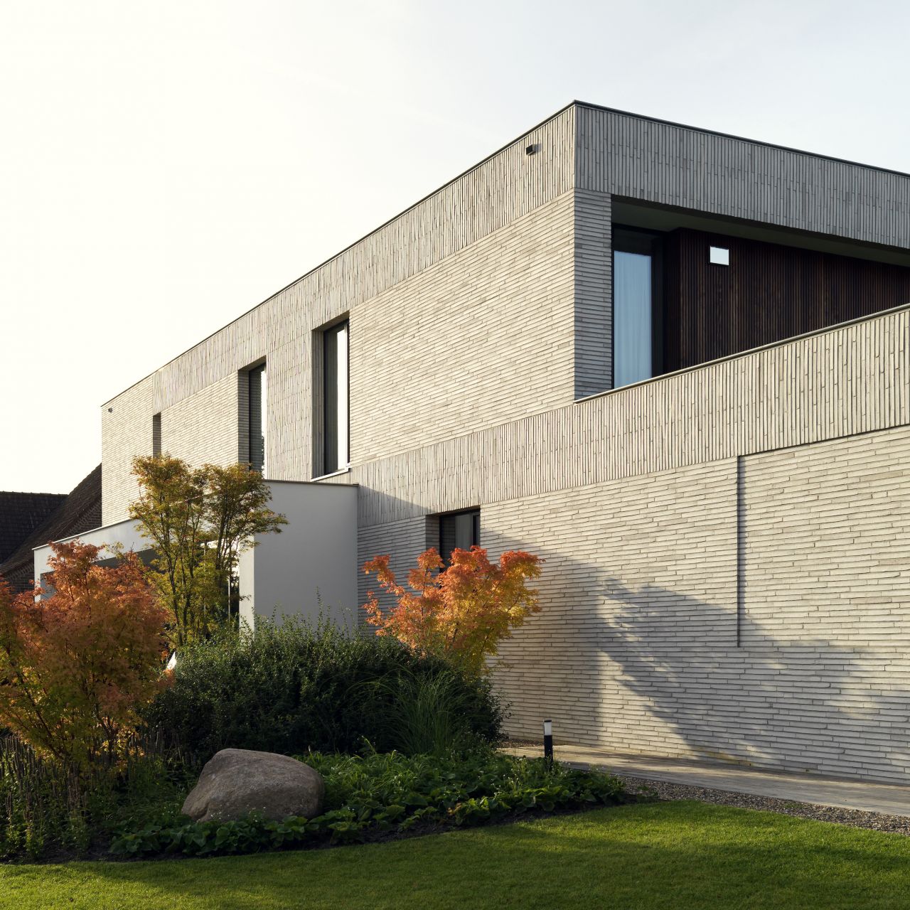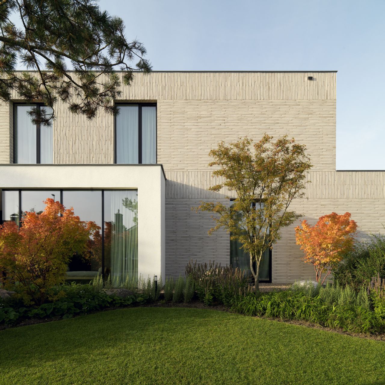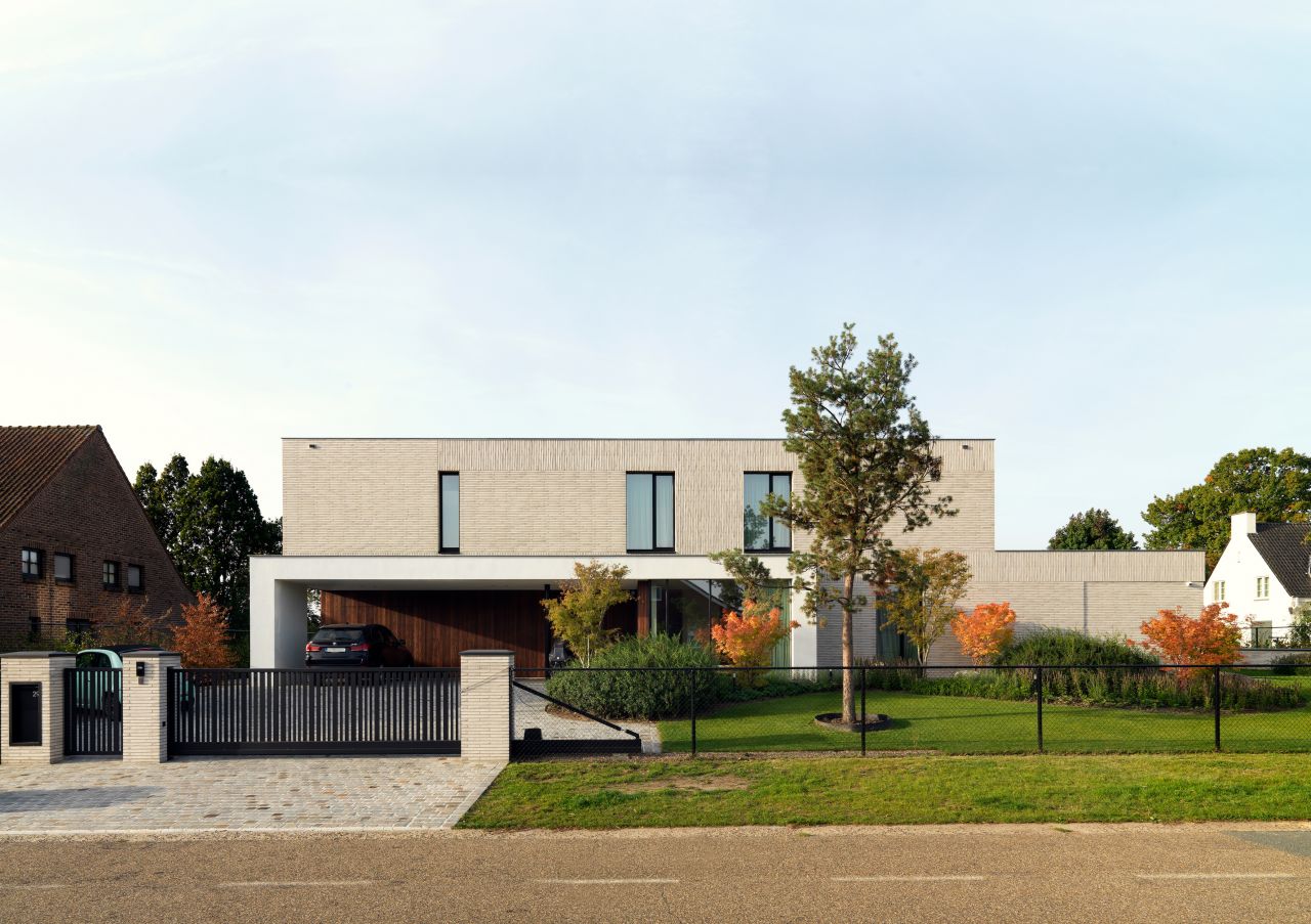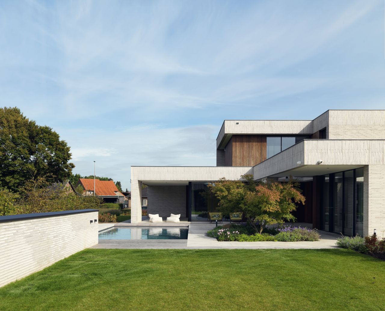 Er is veel aandacht besteed aan de keuze van het metselwerk. De langgerekte lichte baksteen versterkt de belijning in de architectuur. De gelaagdheid van de villa wordt geaccentueerd door een basis van horizontaal metselwerk te combineren met verticale metselwerkverbanden. Tot slot zorgen accentwanden van verticale houten gevelbekleding en een witte luifel in stucwerk bij de entree voor een spannend contrast.