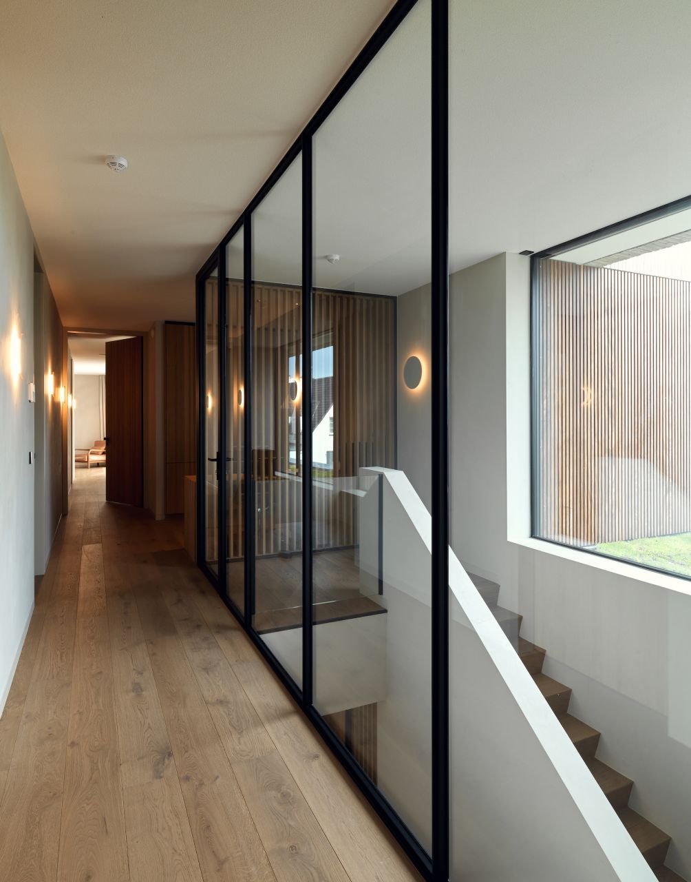 Om privacy en intimiteit te creëren gaven we de woning aan straatzijde een gesloten karakter. Dit in contrast met de achterzijde, waar glas openheid en connectie met de buitenwereld brengt. De woning heeft een open plattegrond, met in het hart een woonkeuken voor het hele gezin. De lange zichtlijnen staan garant voor een optische verbinding met de omringende ruimten. Hier kan iedereen zich terugtrekken zonder de connectie met de tuin te verliezen. Door de strategische plaatsing van het bouwvolume ten opzichte van de zon is er bovendien altijd wel een plek te vinden om van de zonnestralen te genieten. Van de vroege ochtend tot de late avond.