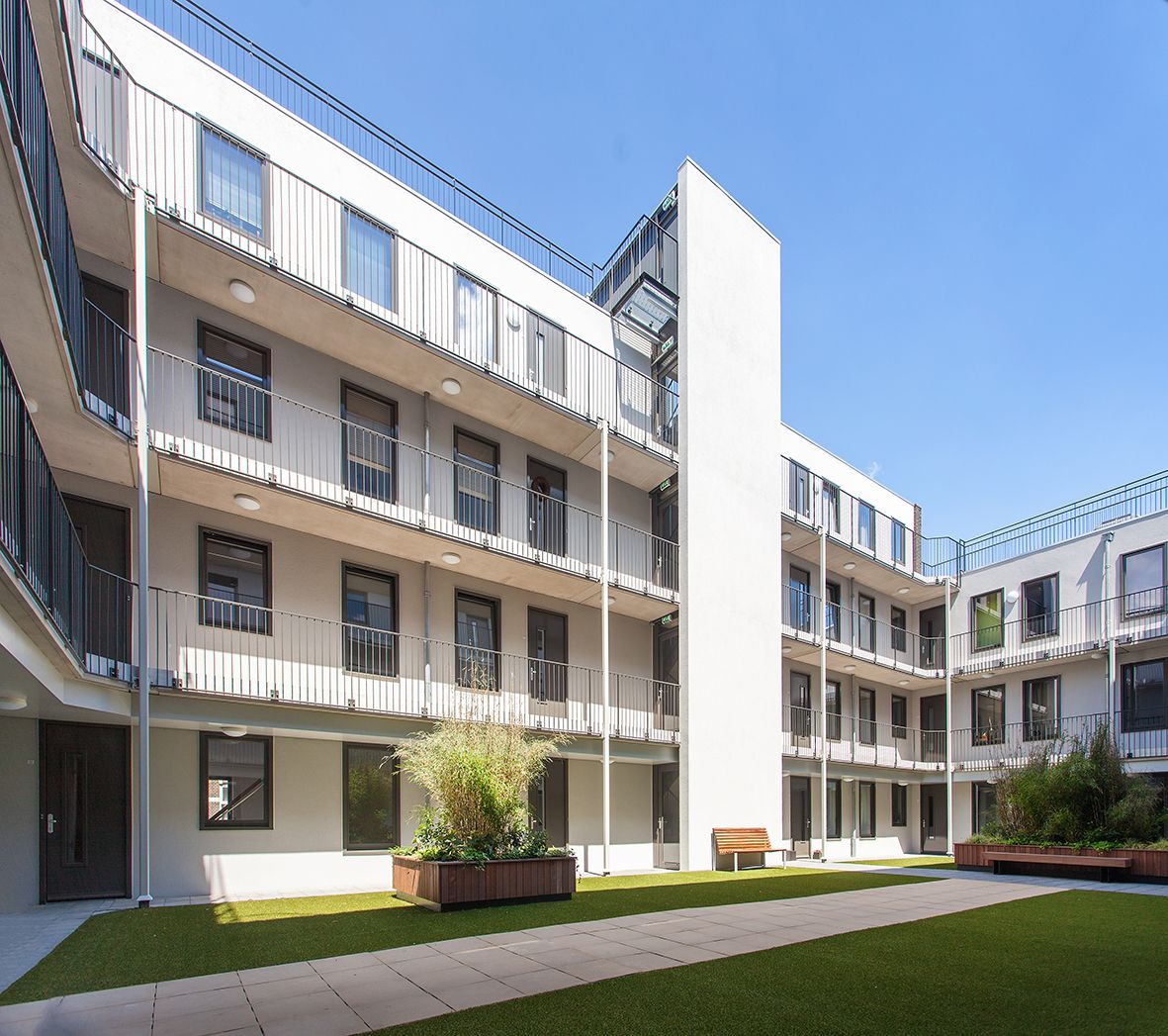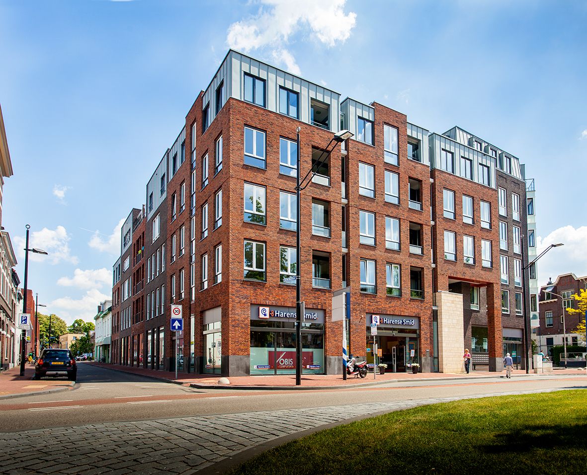 Wij ontwierpen een ondergrondse parkeergarage en een winkel, met daarboven 3-5 lagen appartementen, die aansluiten op de context van het aanliggend plein, de straten en gevelwanden. In terughoudende baksteenarchitectuur hebben wij ons aangepast aan de schaal en de parcellering van de omgeving.