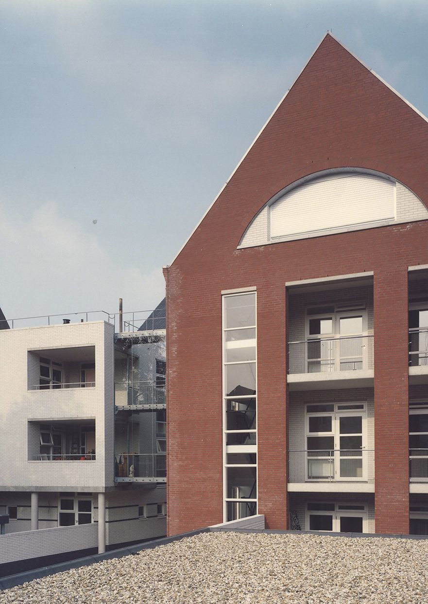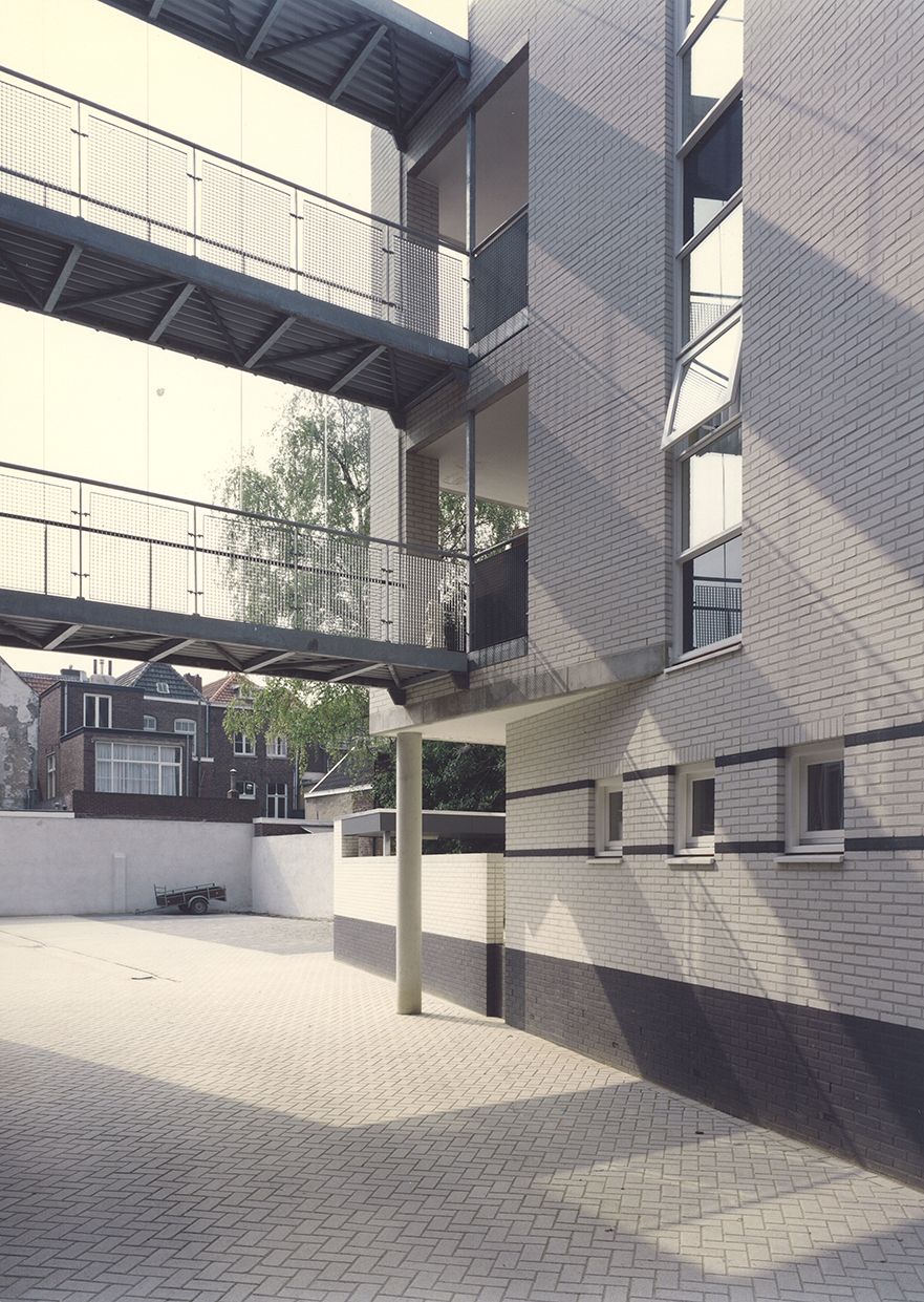In de twee hoge bouwlagen van de schoolvleugel brachten wij drie woonlagen in en op de plek van de woning kwam een nieuw volume. Vóór iedere woning bevindt zich een woonkamer met een splitlevelverbinding naar de achtergelegen woning. Onder de bestaande schoolpoort maakten we een ingenieuze ontsluitingsroute. Het hoofdgebouw aan de straat is geheel gehandhaafd. Aan de verschijningsvorm vanuit de openbare ruimte veranderde niks, belangrijk voor de Roermondenaren die een emotionele band hebben met het gebouw. Volledig gerestaureerd is het monument nu klaar voor de toekomst.