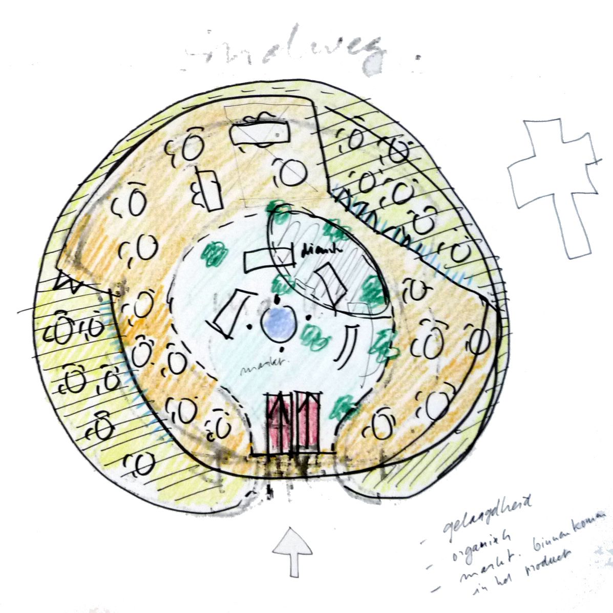 Voor de kruising van de A1 en A6 bij Muiden hebben wij een prototype voor het La Place wegrestaurant ontwikkeld in de vorm van een donut; bagel. Deze vorm wordt "doormidden gesneden" om er als het ware "het beleg” tussen te doen. Veel natuurlijke materialen moeten het verse karakter van de producten van La Place verbeelden en het gezonde karakter ondersteunen. De rustplaats zou een contrast moeten zijn met de functionele, artificiële infrastructuur.