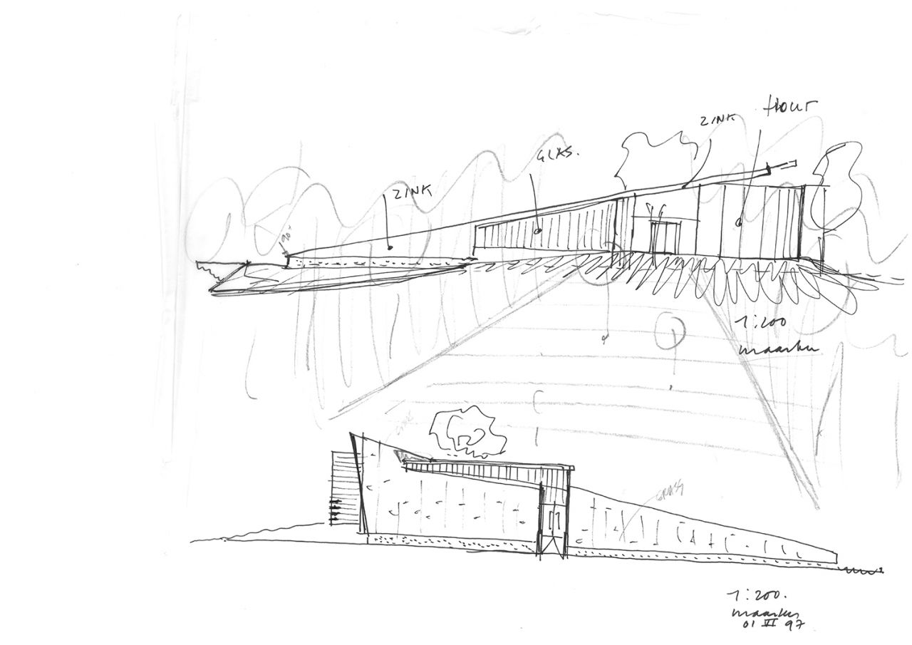 Wij hebben dat als volgt opgelost. In de aanloop naar het gebied op een strook tussen bos- en langbouwgronden hebben wij onder een opgetilde plagge landbouwgrond een onopvallend bouwvolume geplaatst. Richting de weg laat de opgetilde plagge een gevel zien die de mensen uitnodigt. In het gebouw zijn verschillende expositieniveaus aangebracht die het terrassenlandschap van het Meinweggebied karakteriseert. Het materiaalgebruik is uiteraard van duurzame, recyclebare materialen. Zo zijn de toegepaste stenen schelpenstenen.
