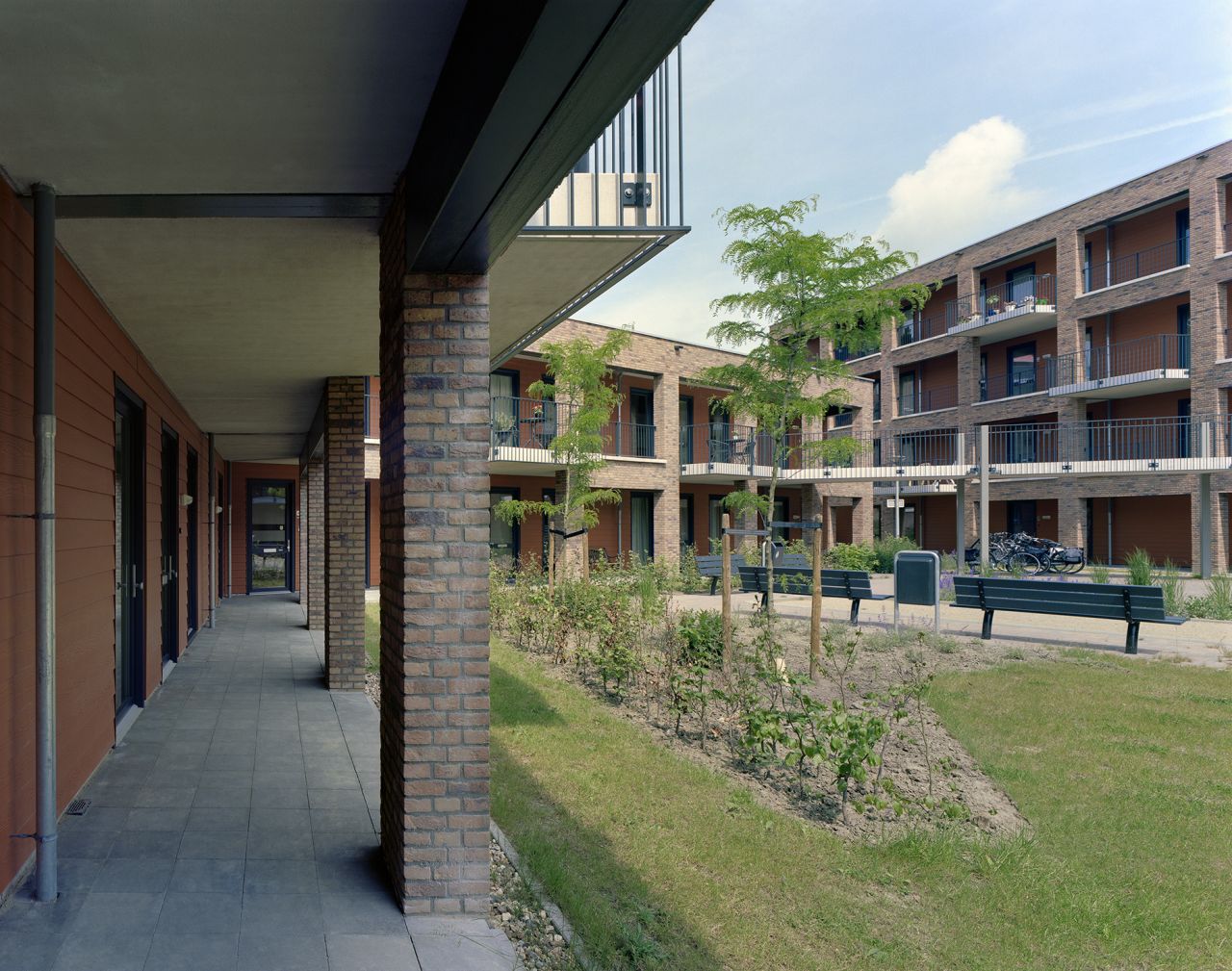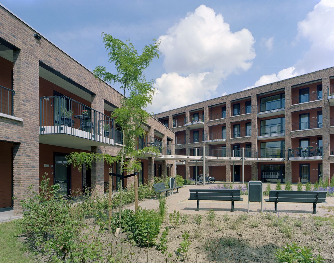 In de jaren ’60 woonwijk Papisland in Middelburg, ligt langs een groene as een schoolgebouw, winkelcentrum en een verzorgingshuis. Een wijk waar de functies wonen, werken en winkelen “keurig” gescheiden zijn. Het schoolgebouw naast het verzorgingshuis stond leeg en vervangende nieuwbouw met senioren serviceappartementen stond op het programma. De oplossing die wij voor Woonzorg Nederland hebben uitgewerkt bestaat uit drie woonblokjes van verschillende bouwhoogten, die een open ensemble vormen rondom een gezamenlijke buitenruimte. In zorgvuldig uitgewerkte gemetselde bouwvolumen zijn 41 aanleunwoningen ontwikkeld in diverse typen. Het is één van de eerste projecten uitgevoerd in VBI flexcasco waarin de installatie voor verwarmen en koelen is geïntegreerd, die aangesloten is op een warmtepomp. Een uiterst comfortabele, veilige en duurzame installatie.