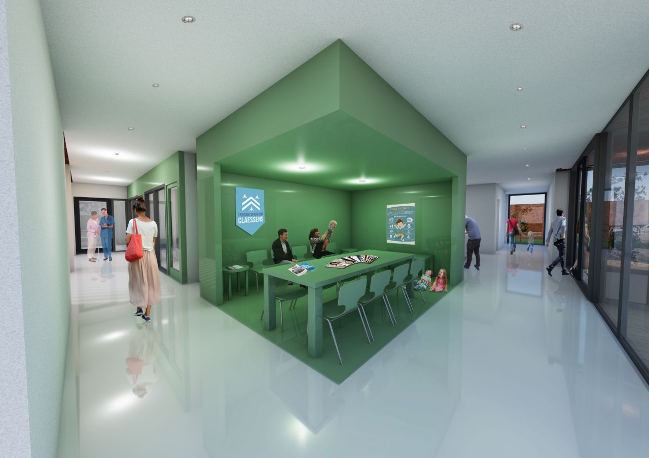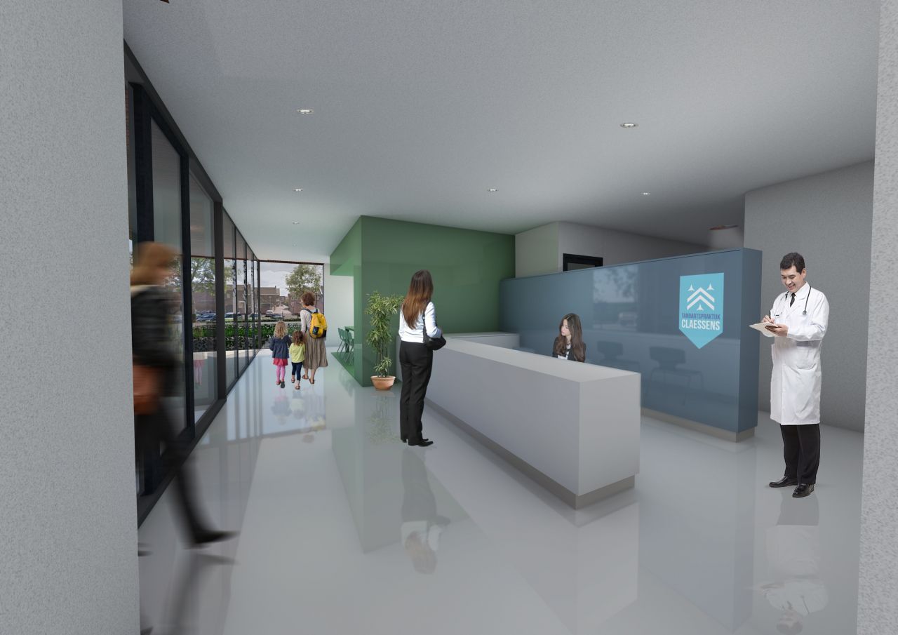 Binnen is de uitstraling verfijnd. Indirect uitzicht op de verstilde, groene buitenruimte zorgt voor rust. We ontwierpen de ideale routing voor de behandelkamers en steriele zone, met veel privacy voor de patiënten. De kantoren en gemeenschappelijke ruimten bevinden zich op de verdieping, als een stedenbouwkundig accent. Een deel van het perceel wordt ingericht als openbaar parkeerterrein voor het centrum van Echt.