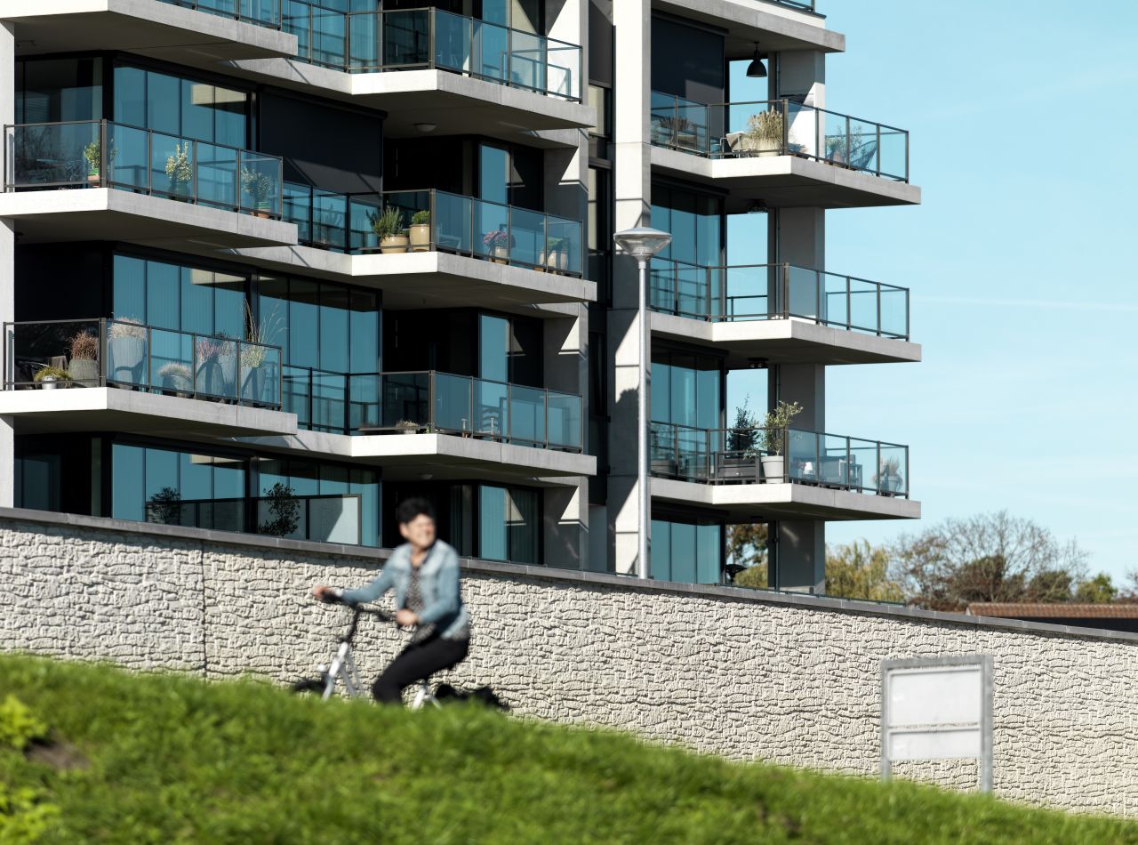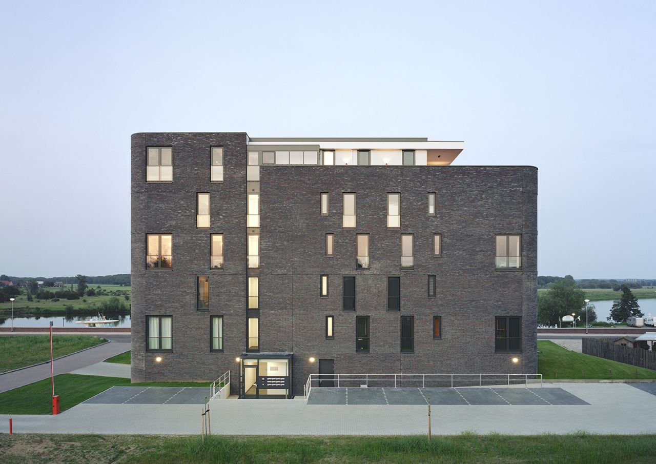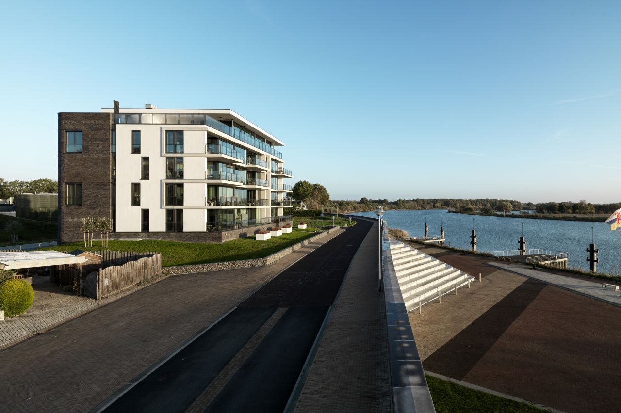 Door veelvuldig gebruik van glas creëerden we een maximaal uitzicht op de Maas. Zelfs de bewoners van de eerste woonlaag kijken vrij uit over het water en de taludtuin met grassen. Dit doordat het appartementencomplex bovenop een parkeerplint staat. De verspringende balkons en het gebruik van wit aan de maaszijde geven het gebouw een open, dynamisch en maritiem karakter. In combinatie met de gemetselde rug en plint van het gebouw zorgt dit voor een mooi ensemble van vorm, materiaal en kleur.