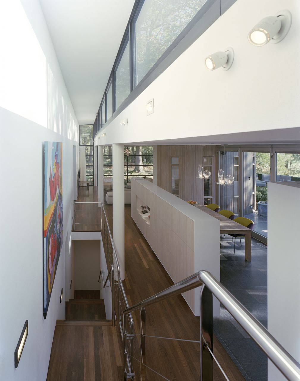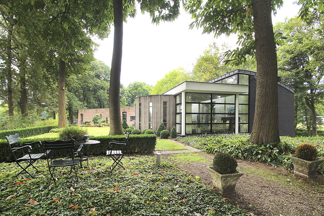 Kenmerkend zijn de lange zichtlijnen in de woning die doorlopen in de gecultiveerde bostuin. De woning is royaal en van alle gemakken voorzien. Alle woonfuncties liggen op één niveau op de berg. Sauna, zwembad, atelier, garage en bergingen liggen deels in de berg, met daarbovenop het gastenverblijf en hobbyruimte. Hierdoor is de bouwmassa mooi geïntegreerd in de omgeving.