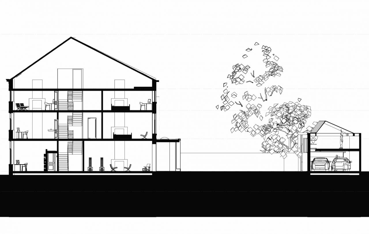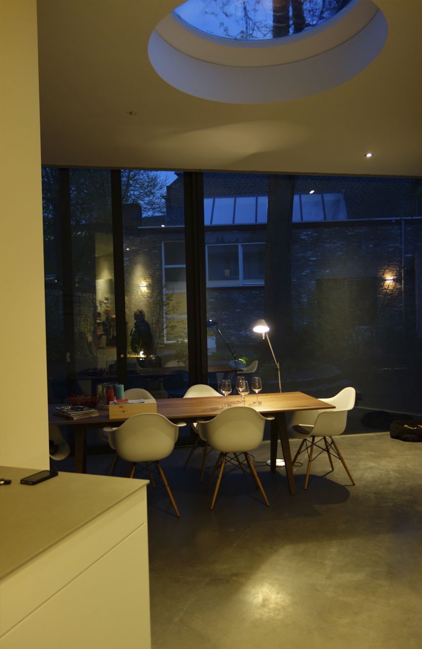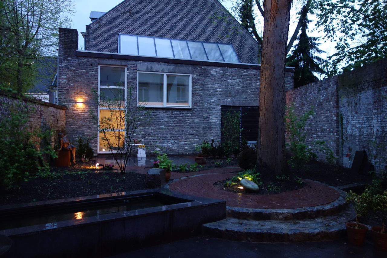 Onze opdrachtgever kocht deze woning in Maastricht van de bekende beeldhouwer Frans Gast. Keramiste Nicole kon het bestaande atelier – met noorderlicht – goed gebruiken als keramisch atelier; veel voorzieningen waren al aanwezig. Nadat de monumentenvergunning binnen was, is het pand volledig gerenoveerd. Elk bouwdeel is wel aangepakt. Aan de tuinzijde is de woning uitgebreid met een nieuwbouw. Hierdoor is niet alleen een relatie gelegd tussen het bestaande woonhuis en de prachtige stadstuin, maar kwam er ook een ruimtelijke verbinding van de woon- en eetkamer met de open keuken. De uitbouw biedt royaal zicht vanuit alle ruimtes van de beganegrond op het atelier.