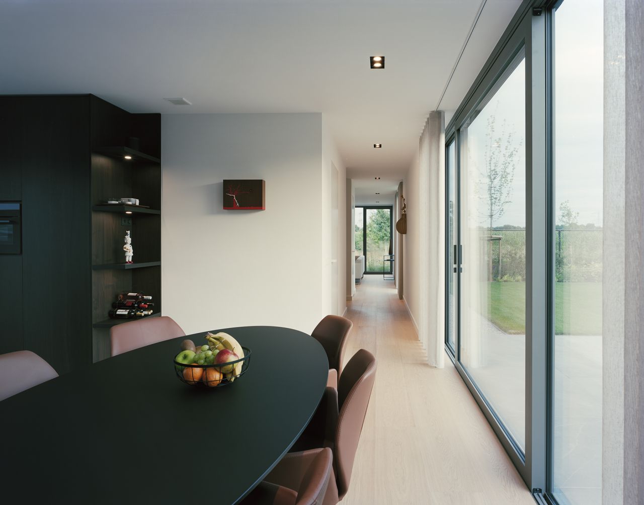 Het woonhuis is in de diepte op de kavel geplaatst, met de woonkamer aan de straatzijde en de keuken en eetkamer aan de achterzijde. Om een optimale verbinding met de omgeving te realiseren zijn de openingen in het bakstenen volume strategisch geplaatst. Zo wordt dankzij grote glazen puien in de langsgevels de breedte van de kavel volledig ervaren. Dit zorgt voor een ruimtelijk gevoel en creëert verbinding met de tuin. Met aan de ene zijde een beschutte plek achter de buitenberging, waar men kan genieten van de ochtendzon. En aan de andere kant het terras dat leidt naar de rest van de tuin. Daarnaast omlijst het kozijn van de glazen wand aan de voorzijde het weidse landschap. Een prachtig stilleven!